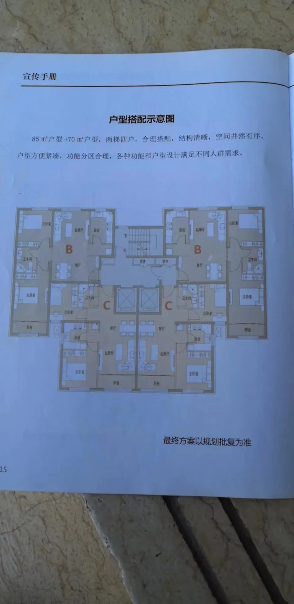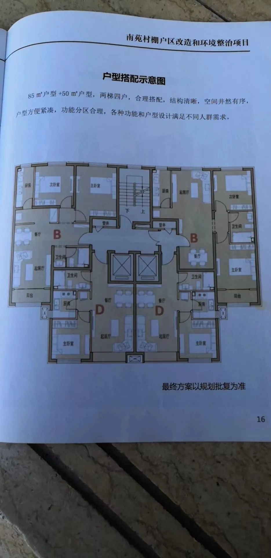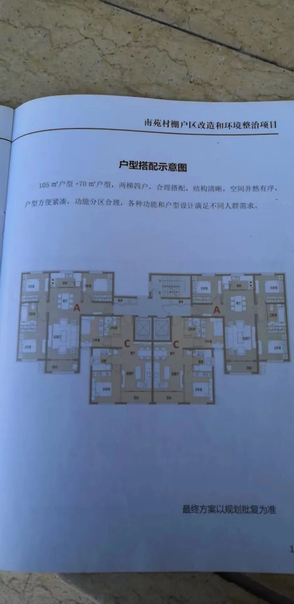 安置回迁楼的主力户型分为50平米一居、70平米二居、85平米二居以及105平米三居四类户型(户型最终以实际交房为准),两梯四户,公共区域(除楼梯间为普通装修外)和电梯厅均做装修,墙、地面全部粘贴装饰瓷砖;