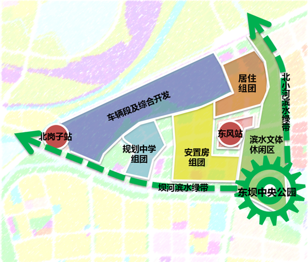 该区域中部规划八处东坝乡安置房地块(黄色图块)